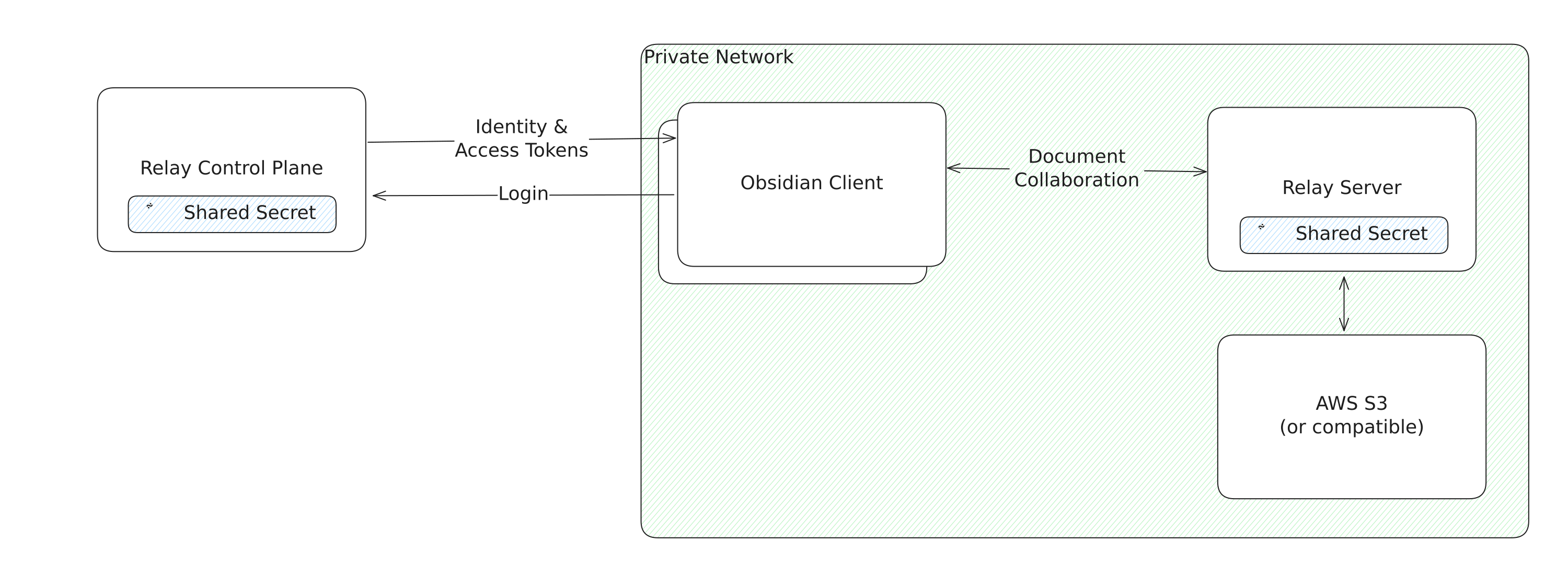 Self-hosting a Relay Server provides total document privacy. Obsidian users are granted document-scoped access tokens by the control plane which are valid for 1 hour. The Relay Server does not need to access the public internet.