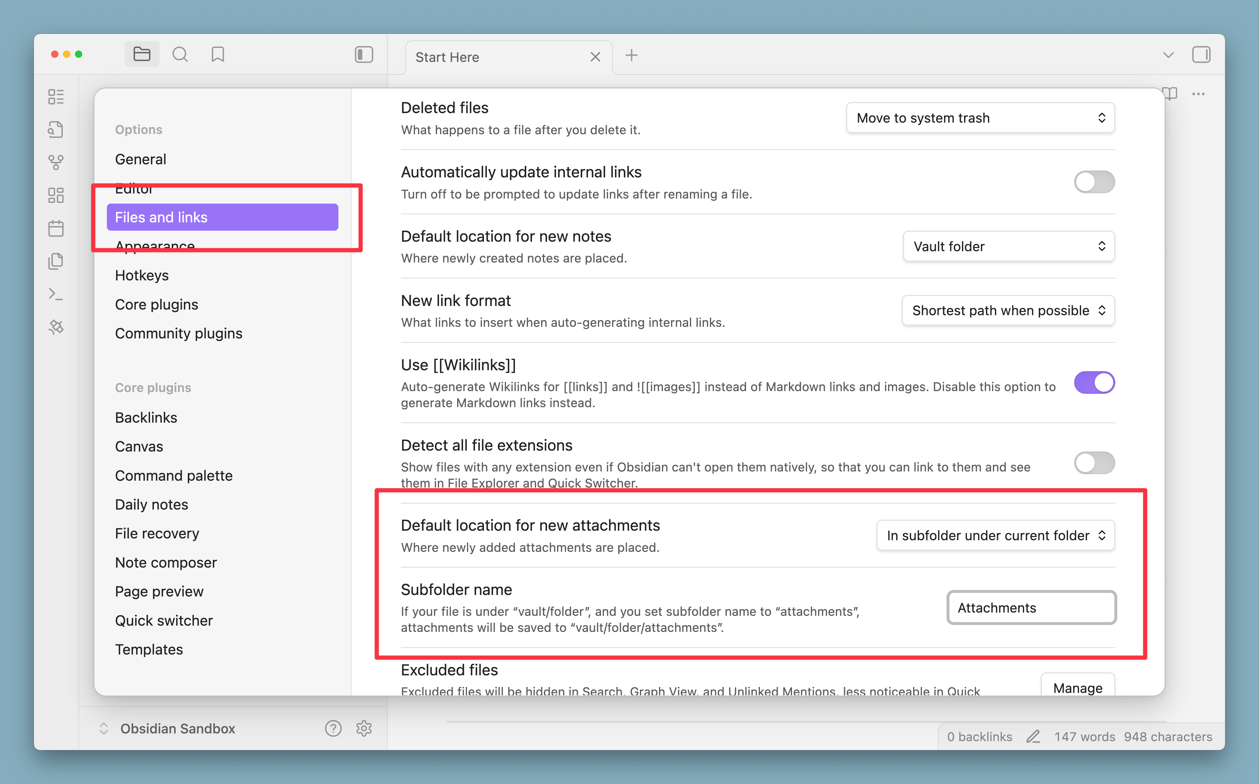 With this configuration, attachments are saved directly in the same folder as the note you're working in.