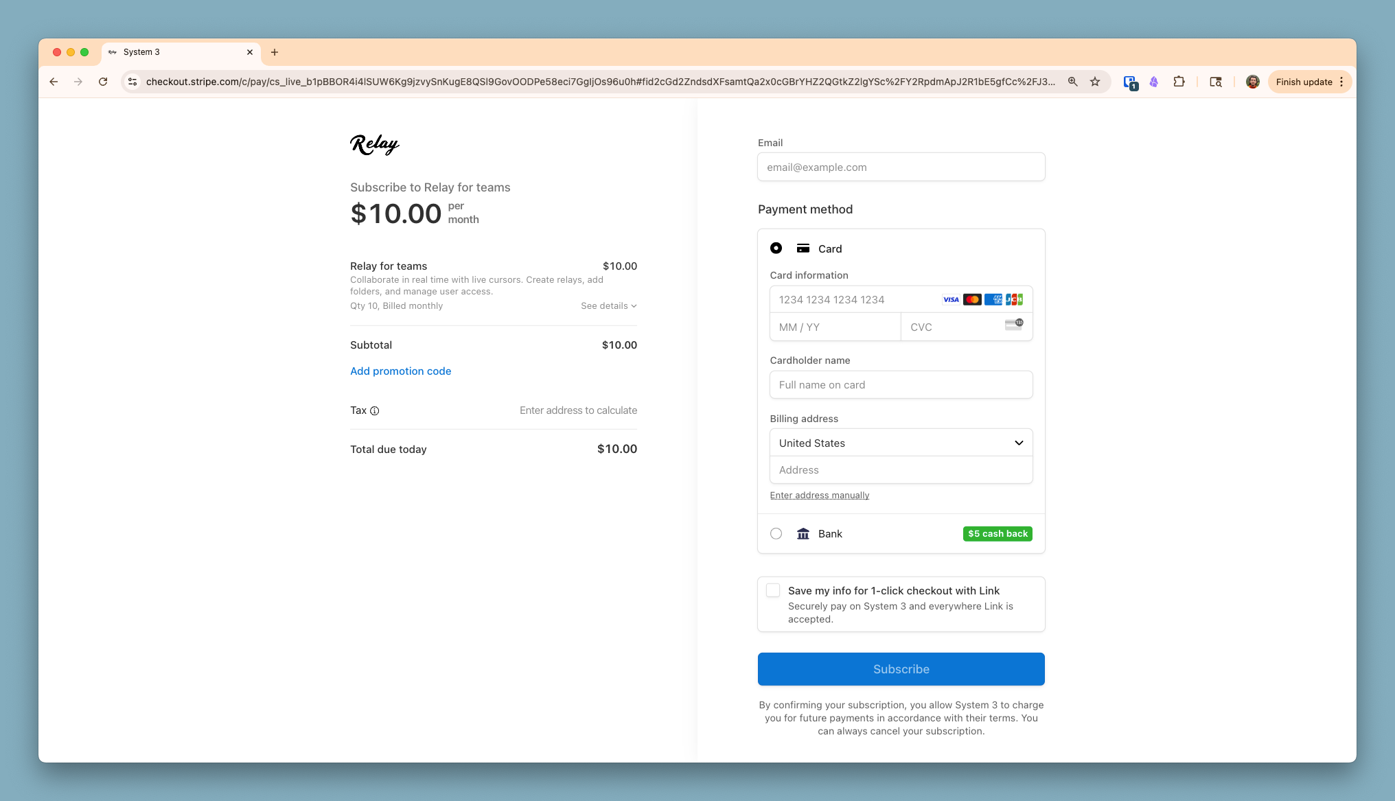 You'll be taken to a web page in your browser, where you can complete payment with Stripe. Enter your info and hit Subscribe to complete the upgrade.