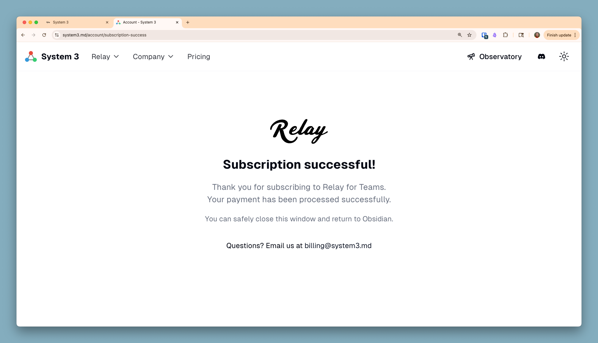 If your purchase was successful, you'll see the success screen. You can now return to Obsidian and enjoy your paid tier access. We appreciate your support!