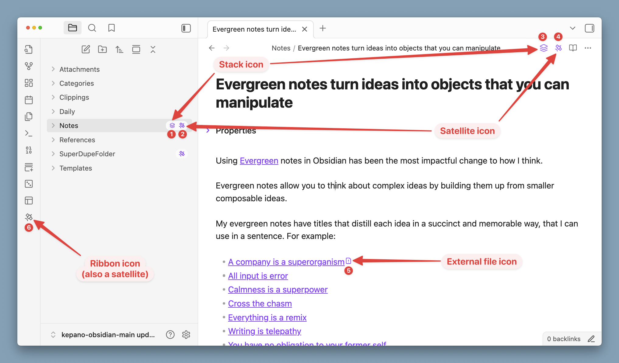 Relay adds several icons to your Obsidian interface to give you important status information and quick access to controls.